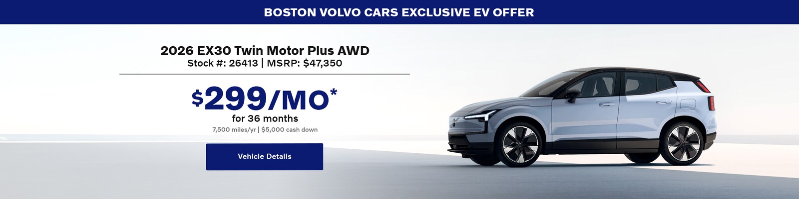 *Applies to stock # 26413. 2026 EX30 Twin Motor Plus AWD. MSRP $47,350. $299 per month. 36 months. 7,500 miles/yr. $5,000 cash down payment. Includes $7,500 EV Bonus, $500 Volvo Loyalty, & $1,000 Costco Membership. Does not include taxes, title, registration, license, insurance, maintenance, and dealer fees. No security deposit required. Lessee is responsible for excess wear and mileage over 7,500 miles/year at $0.25 / mile. Offer available to qualified customers that meet Volvo Car Financial Services (VCFS) credit standards at authorized Volvo Cars retailers. Not everyone will qualify. Car shown with optional equipment. All offers are subject to vehicle availability. See dealer for complete details. Offer ends February 2, 2026.